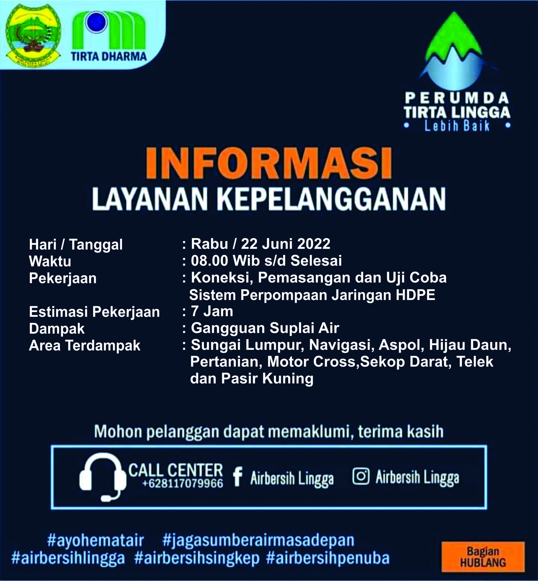 INFO : Kepada Yth. Seluruh Pelanggan Perumda Air Minum Tirta Lingga khususnya Wil. Singkep Beberapa hari ke depan Pendistribusian dibeberapa wilayah mengalami gangguan dikarenakan Waduk Gemuruh mengalami pengurangan Debit Air. Untuk itu diharapkan kepada pelanggan agar dapat melakukan penampungan da